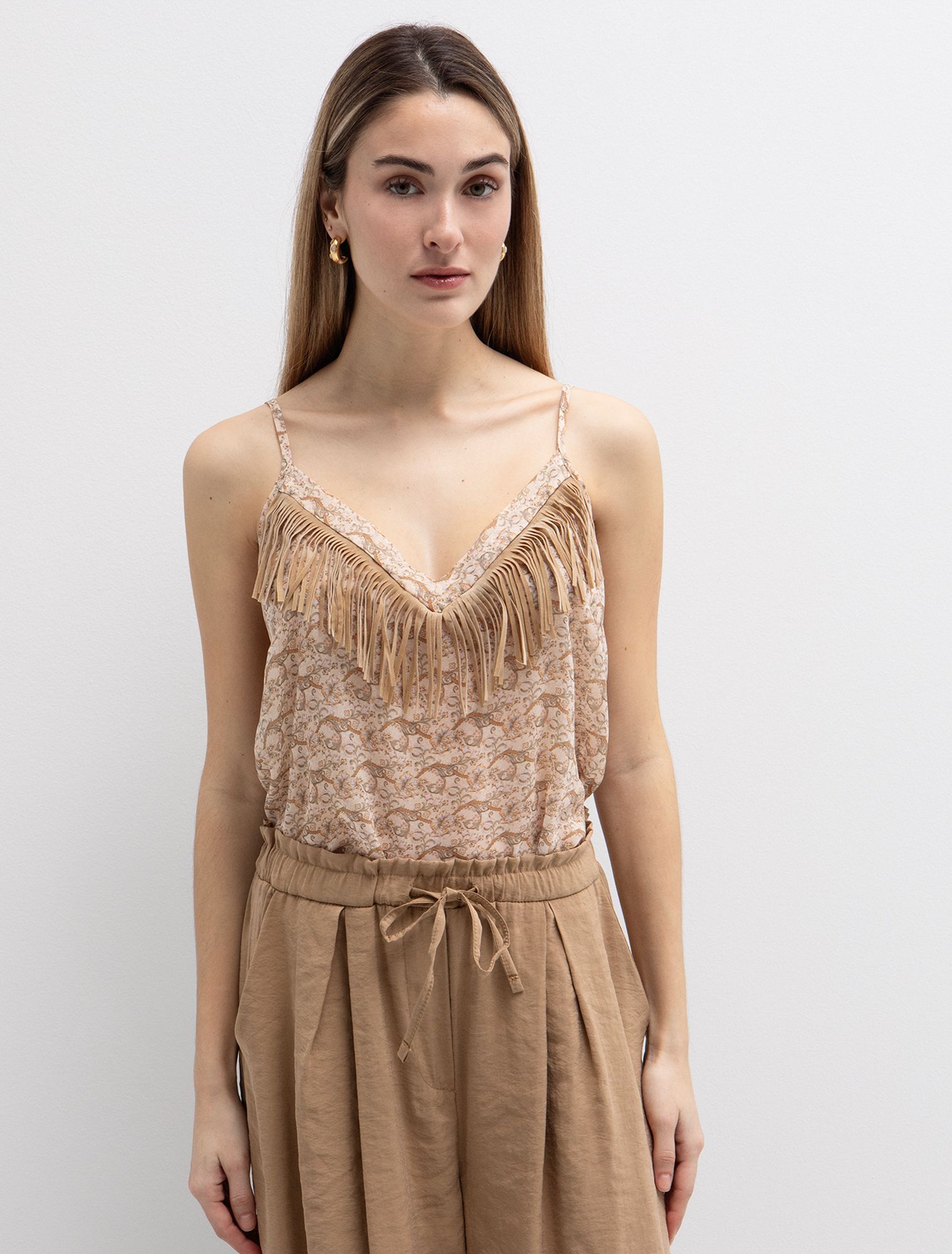 Εμπριμέ τοπ με suede κρόσσια